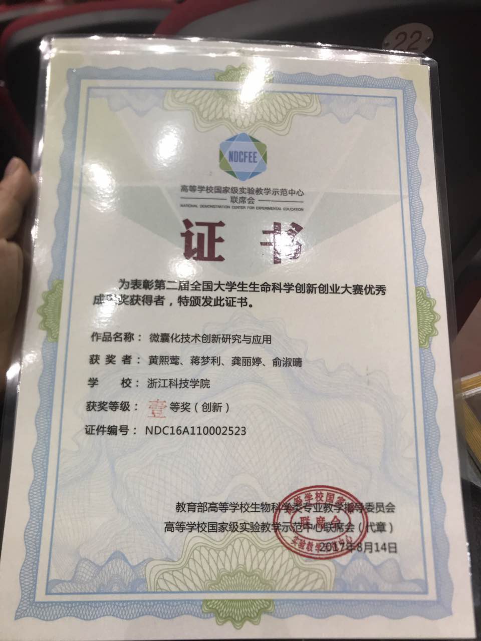 大赛分初赛和决赛两个部分。在激烈的竞争中,我校代表队准备充分,高度重视,认真负责,以出色的讲解和现场答辩过关斩将,最终,由陈丽春老师指导,黄熙莺、蒋梦丽、龚丽婷、俞淑晴4位同学主持的项目《微囊化技术创新研究与应用》获得全国一等奖,实现了我校在该项比赛中的新突破。