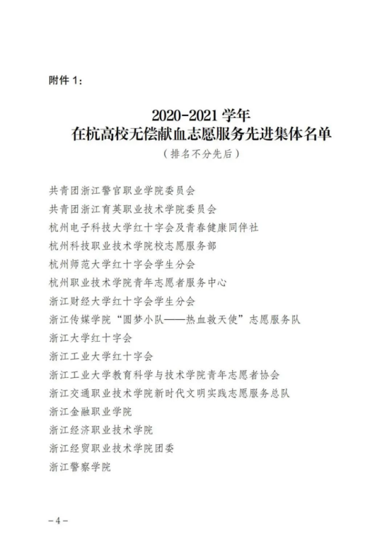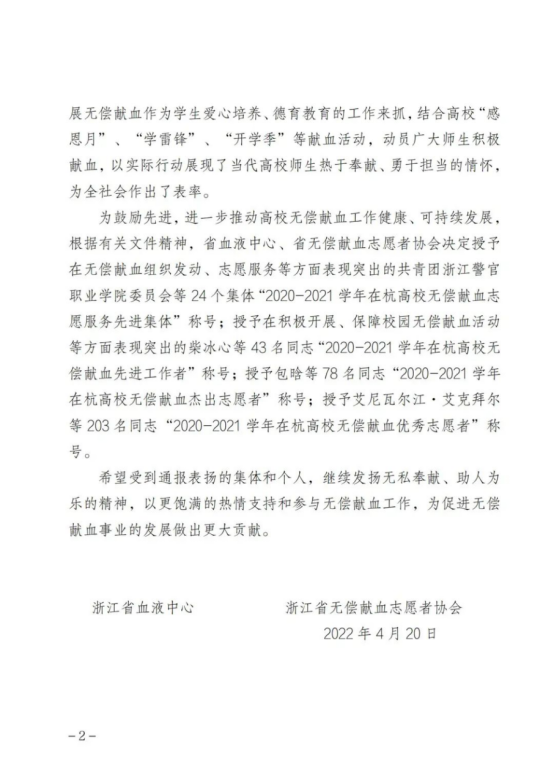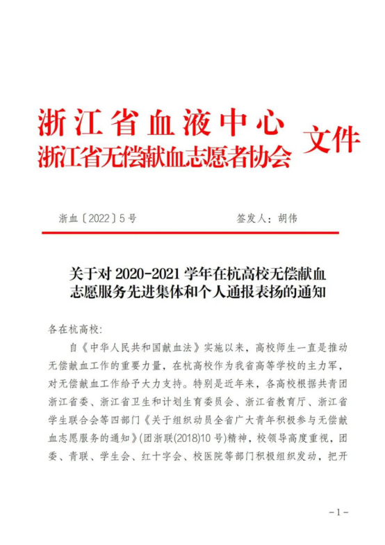 近日,浙江省血液中心、浙江省无偿献血志愿者协会发出通报,表扬在2020-2021学年无偿献血活动中表现突出的志愿服务先进集体及先进个人。浙江科技学院生化学院志愿者协会因组织表现突出,名列其中,受到省级通报表扬!此次通报表扬既是对我院长期以来积极开展志愿工作与成果的肯定,也是对未来我院继续坚持爱心献血事业的激励和鼓舞。同时,无偿献血活动也充分展现了不论是浙科人还是生化人“使命在肩、青春担当”的风采。