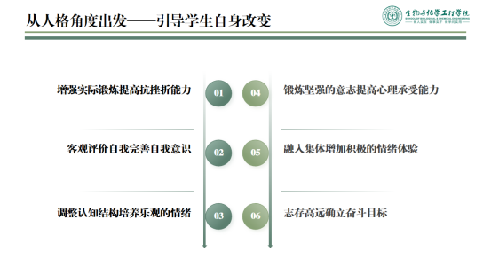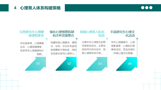 研究生辅导员蒋小艺从“聚焦研究生心理关怀,构建心理育人体系”的角度出发,提出从完善研究生心理健康课程体系、强化心理预警机制和关怀资源整合、加强心理育人队伍培训、丰富研究生心理文化活动四个方面构建心理育人体系。