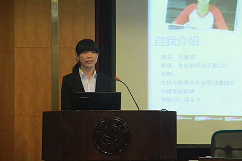 第九届学生会主席尉晓旭从学生会机构介绍、学年回顾、展望未来三个部分进行了2013年度总结,在图文并茂的结合下,我们看到了无论是在运动会、大合唱还是各项学科竞赛上,生化学院学工工作都上交了一份圆满的答卷。随后,第九届分团委副书记张宏捷汇报了2013-2014年度团费收支情况。学生会副主席杜鹏介绍此次学生会主席团竞选规则,宣布竞选开始并介绍竞选者。六位候选人依次上台发表了精彩演说,现场掌声阵阵。参会学生代表在认真听取六位竞选者的竞职演说后进行了民主投票。