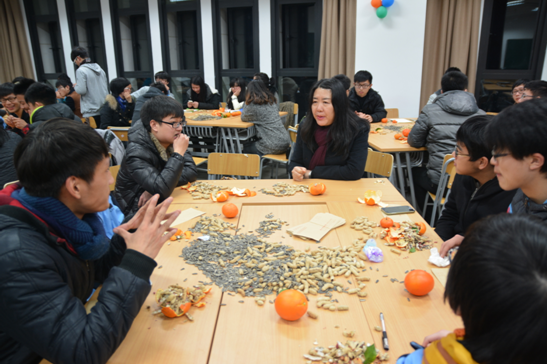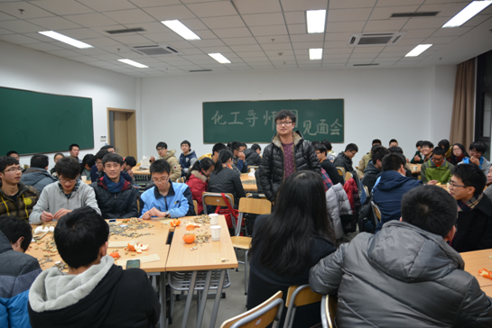 整个团队的成员充分利用了圆桌教室的优势,导师学长们平均分坐到每个学生小组中,为同学们解答关于专业的问题。同学们对化学专业知识的热情和求知欲让他们顾不得害羞或是内敛,都迫不及待地吐出累积在心里许久的问题。每一个或复杂或简单的问题,都有导师们耐心仔细的回复解答。而刚经历过大一的学长学姐们也都很耐心的讲述着自己的学习方式以及成功秘籍,同时还为同学们介绍了一些关于出国发展或者和国企外企合作化工方面项目的条件和奋斗方向。显然临近期末,同学们压力很大,导师们便把课题都放到了寒假,给同学们更充分的复习时间,再有何英洛学长倾情分享宝贵的期末复习经验,众学子受益颇深。虽然本次没有提出课题,讨论依然激烈,期间更有学长和大一同学的献唱,也正是如此有亲和力的画面让整个讨论会持续火热。