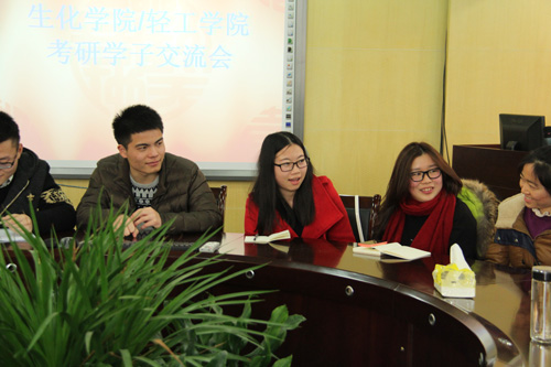 会议由生化学院/轻工学院院长刘士旺老师主持。首先,毛建卫老师用幽默风趣的语言一一问候了所有考研学子的相关情况,询问了考研过程中存在的困难,结合自身经验为考研学子讲述面试时的注意事项。会场不断响起阵阵掌声和开怀笑声。接着,楼坚老师介绍我院考研的学科建设情况以及考研方面的优势。葛龙威书记祝愿考研学子通过笔试并希望他们最终都能进入理想院校。最后王永江副院长作了精彩的总结,真切希望考研学子能够留下来在自己学校读研。在掌声和期盼中本次交流会圆满落幕。
