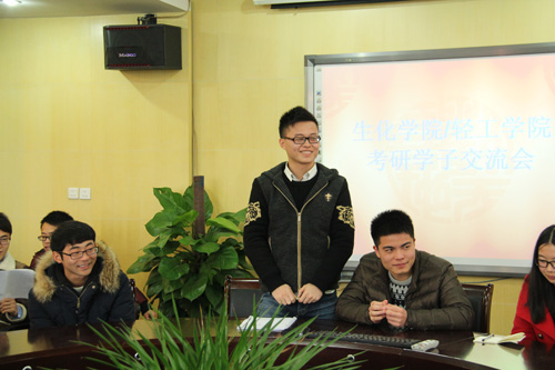 2015年3月6日12:30,生化学院/轻工学院2011级考研学子交流会在重点实验室3楼会议室拉开帷幕。校党委委员、宣传部部长毛建卫老师莅临指导,生化学院/轻工学院院长刘士旺、副院长王永江、院党总支副书记葛龙威和楼坚、楼天宇、滕昱等老师出席会议。