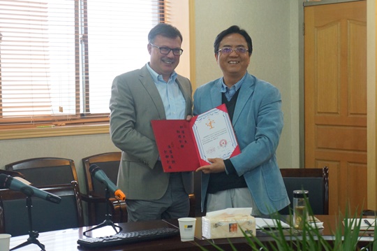 Thomas Efferth教授被聘为生化学院/轻工学院和省重点实验室客座教授,毛建卫教授为Thomas Efferth教授颁发了客座教授证书。
