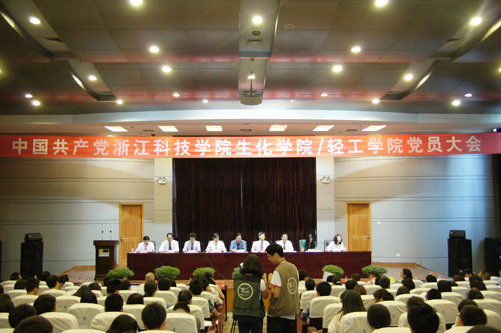 5月24日下午,浙江科技学院校园内绿树成荫,欢声笑语。设在图书信息中心报告厅的大会会场庄严肃穆,《歌唱祖国》、《我们走在大路上》等爱国歌曲激昂豪迈。中共生化轻工学院委员会第一次全体党员大会在这里隆重举行。校党委组织部部长楼少敏代表上级党组织出席会议,校党委委员、宣传部部长毛建卫到会祝贺,我院党政班子、教工党员、学生党员参加会议,学院离退休老领导、民主党派代表、教授代表等应邀列席大会。会议由学院党总支副书记葛龙威主持,大会主席团成员在主席台就座。
