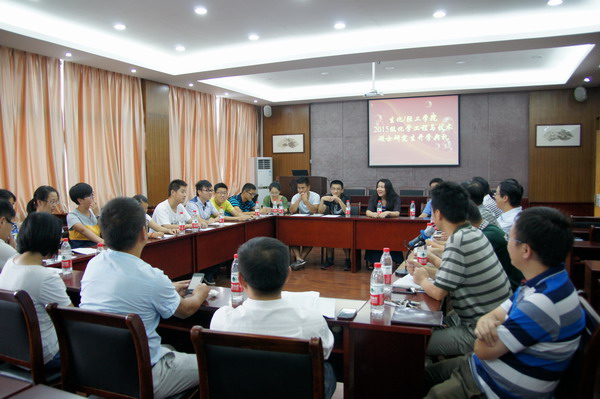 7日下午,我院在C2-530会议室隆重举行2015级研究生开学典礼,会议由学院副院长王永江教授主持。校党委委员、化学工程与技术学科负责人毛建卫教授、校研究生处副处长肖功年副教授、生化轻工学院全体党政班子成员以及部分研究生导师出席了开学典礼。毛建卫教授对2015级的研究生殷切寄语,希望研究生三年既要培养自己的科研修养和人文修养,将自身内涵做实,也要开拓自己的国际化视野和产学合作视野,将自身的格局做大。刘士旺院长代表学院全体师生向2015级新研究生的到来表示热烈欢迎,希望研究生同学利用好学院的研究资源,在导师的指导下,培养自己科学严谨的求实作风,勉励同学们珍惜时间,对自己高标准严要求,科学合理规划自己的研究生生活,认真做好研究,脚踏实地的做人做事做学问。学院党委书记范伟刚希望新生能继承发扬学院三实办学的特色,特别是要树立良好的学术风气,修身立德,牢记使命责任。导师代表黄俊教授、2014级老生代表陈南男和2015级新生代表申东明分别在会上发言。
