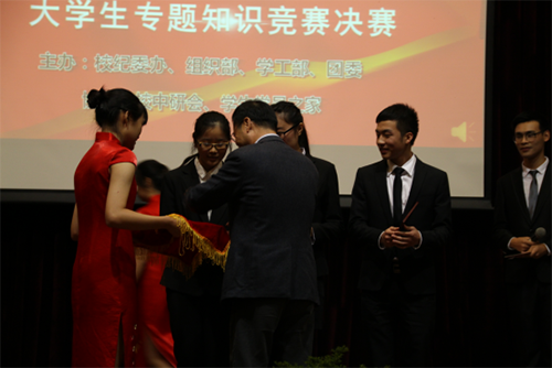 校党委副书记赵东福老师福精彩的开场致辞使现场气氛活跃起来,台下响起雷鸣般的掌声。随着主持人缓缓的读题声,比赛也正在有序不紊的进行着。第一轮“必答题”题目涉及范围广、难度适中,主要考选手对党规党章党史基本知识的了解程度。当主持人宣布“先锋队”本轮得分满分200分的时候,台下的掌声经久不息,在场观众都被我院“先锋队”扎实的知识基础所折服。在随后的“抢答题”“音频题”环节,我院选手越战越勇,分数也一直名列前茅。在最后一轮的“时政评论题”环节,我院徐璐同学结合党章党规党史有关知识详细认真阐述了自己的观点和看法,博得现场评委老师和同学的一致好评。比赛之中穿插的互动问答点燃了现场活跃的气氛。在校纪委书记李泽泉老师的精彩点评中,此次“三学三比”知识竞赛圆满落幕。