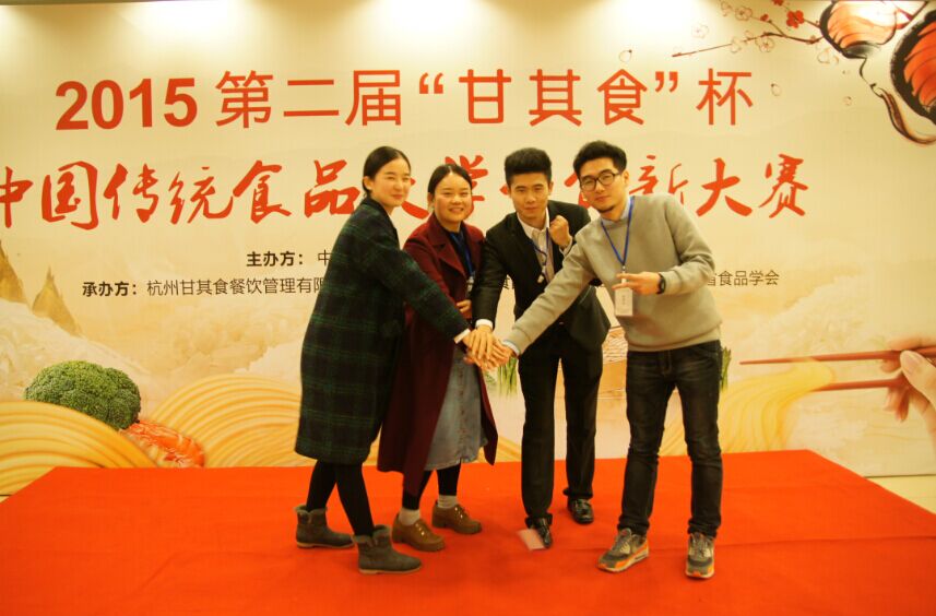 2015年11月28日至29日,由浙江省食品学会、杭州甘其食餐饮管理有限公司和浙江工商大学食品学院共同举办的“甘其食”杯第二届(2015)中国传统食品创新大赛顺利落下帷幕。经过作品申报、文本评审,选出了来自江南大学、浙江大学、浙江工商大学、浙江科技学院、浙江农林大学等高校的16支决赛队伍和17支获入围奖队伍。当天,进入决赛的各支队伍首先进行了产品制作、成果展示,专家品尝和现场答辩等环节。各支队伍各展所长,制作了众多“色·香·味”俱全的中国特色传统食品,一些常见食材通过选手们的巧手展现出别样的风采。