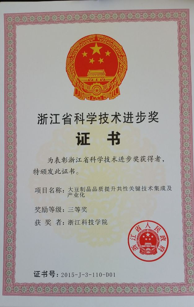 近日,在省人民大会堂召开的2015年度浙江省科学技术奖励大会上传来喜讯,我院蒋成君高工主持的“高纯度氟喹诺酮类药物绿色合成技术开发及产业化应用”获得2015省科学技术进步奖二等奖,肖功年教授主持的“大豆制品品质提升共性关键技术集成及产业化”获得2015省科学技术进步奖三等奖。