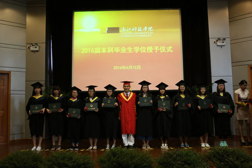 毕业生们身着学士服,一一与老师们握手感谢后依次上台,接受了校学位委员会成员们为自己颁发的学位证书和纪念徽章,并与叶高翔校长合影,完成了四年大学生活中最尊严的仪式。