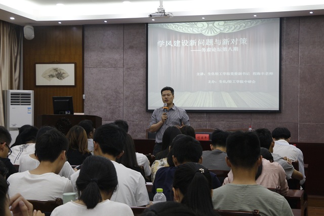 5月22日晚,生化/轻工学院中国特色社会主义理论体系研究会第八期“务虚论坛”在C2-530召开。生化轻工学院党委副书记程海丰应邀出席本次论坛,与学院2015级各支部党员和积极分子畅谈学风建设话题。