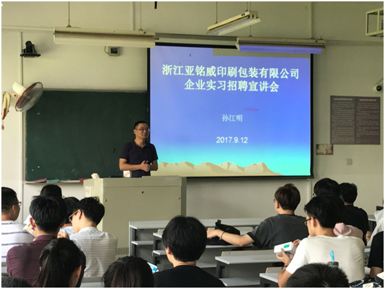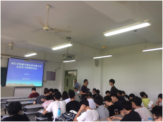 为了给毕业生们提供更好的就业机会,帮助企业寻找人才,9月12下午13:30,浙江亚铭威印刷包装有限公司企业来我校于A2教学楼202教室进行2017校园宣讲招聘会,我院14级包装工程专业共72人积极参与了本次招聘会。