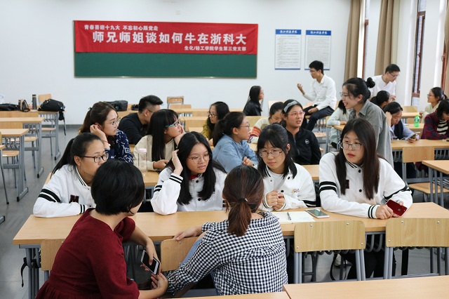 本次活动中,楼书记担任主持人,各位党员和预备党员也分工明确,更是邀请了研究生党员进行全程指导,向大一的学弟学妹们详细介绍了入党流程、学风建设、奖学金评定、学科竞赛等方面的内容,作为学长学姐的我们也积极向新生们分享了各自生活学习方面的经验。楼书记更是有感而发,指出学好掌握一门技术,才能为今后铺好路,同时向新生们讲解了就业创业的先进思想。最后的面对面零距离交流,将此次活动推向了一个高潮,新生们都积极参与其中,提出了关于专业培养、课程学习、就业等方方面面的疑问,师兄师姐们热情积极回答,并给出自己经验和建议。