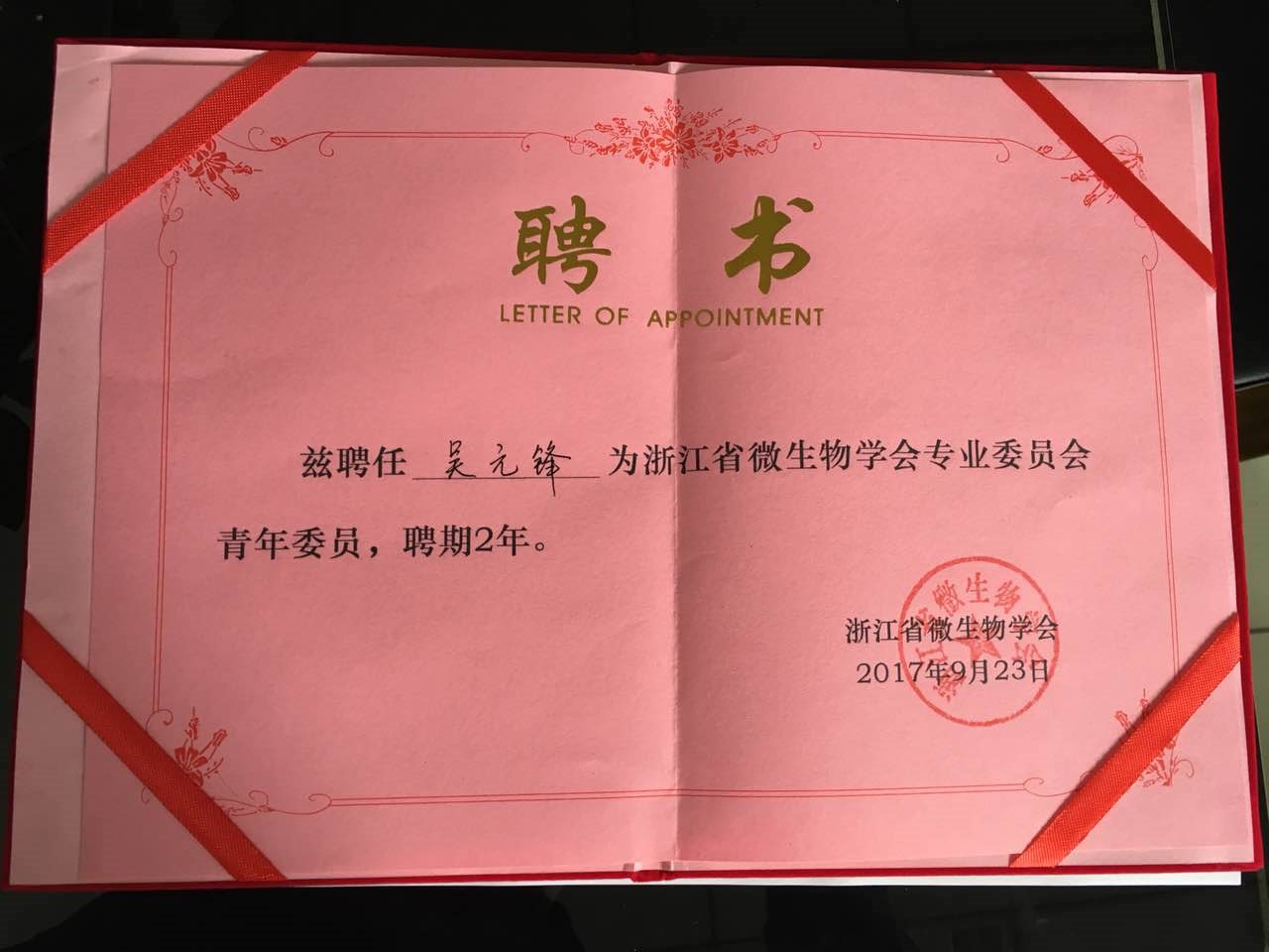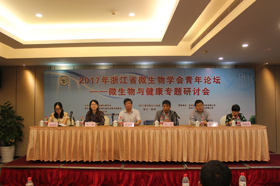 2017年9月22日-24日,“2017年浙江省微生物学会青年论坛——微生物与健康专题研讨会”在杭州曙江大酒店举行。此次论坛由浙江省微生物学会主办,浙江省微生物学会青委会、浙江理工大学和浙江省植物次生代谢调控重点实验室共同承办。全省大专院校、科研院所、杭州全谱实验室设备有限公司、杭州三合创新科技有限公司等30余家单位的近100名代表参加了本次论坛。会议分开幕式、会议报告和研究生专场报告三部分。在此次会议上,吴元锋教授被聘为浙江省微生物学会专业委员会青年委员。