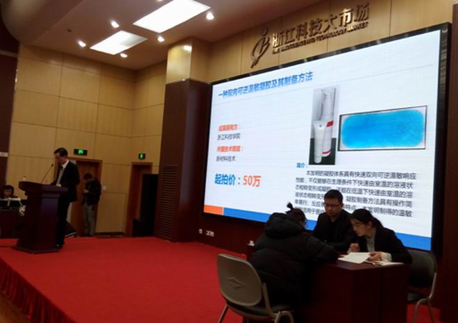 在网上技术市场活动周重要系列活动之一---2017年浙江省秋季科技成果竞价(拍卖)会上,我院黄娟博士主持研发的技术成果“一种双向可逆温敏凝胶及其制备方法”参加拍卖。该成果起拍价为50万元,经过4轮竞拍,终于以90万元成交,溢价率为80%。