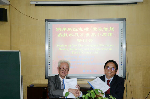 省2011协同创新中心主任毛建卫教授作《新型电磁/微波智能热技术及在食品中应用》的学术报告;合默麟机械股份有限公司游先生介绍了公司设计制造的新型电磁/微波智能热加工装备。