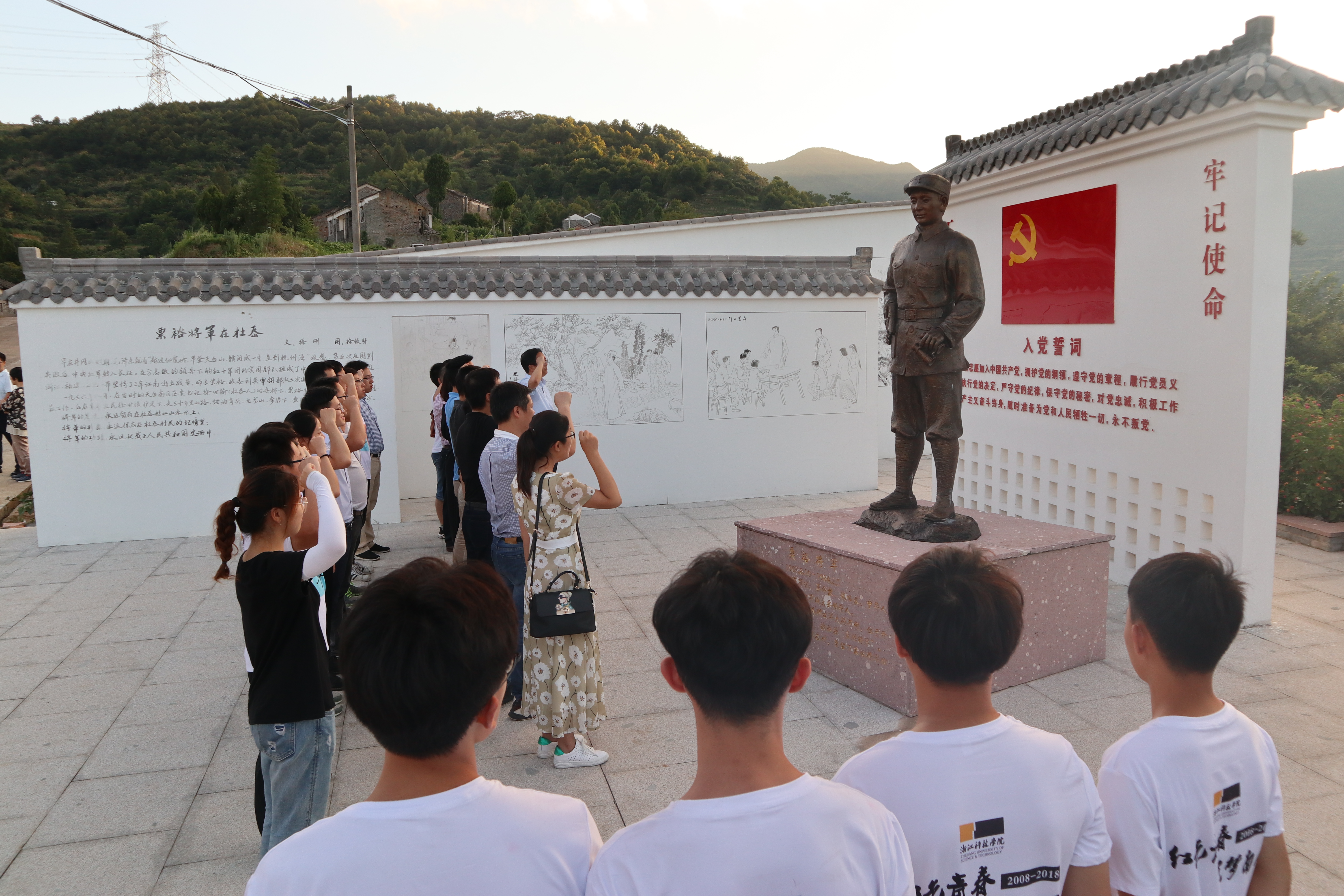 会后,浙科院一行走访参观杜岙村粟裕将军公园、前杨村四知堂廉政文化教育基地等,交流了解南屏乡党建、旅游、文化、农林、科技等方面工作,进一步达成共识,加强合作。毛建卫教授来到南屏暑期社会实践团队工作生活的南屏学校探望南屏队员,品尝了我们自己动手制作的晚餐后他连声称赞。最后,南屏队员们随毛老师一行在粟裕将军公园听老党员讲述粟裕将军在南屏的故事并庄严宣誓。