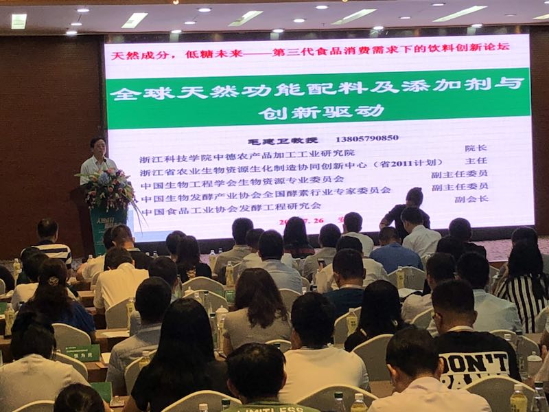 2018年7月26日至27日,以“天然成分,低糖未来”为主题的“中国第三代食品消费需求下的饮料创新论坛”安吉召开,浙江省饮料工业协会,浙江科技学院等主办。可口可乐、达能、芬美意创香、普若味可、伊藤园、娃哈哈、东鹏、安利、农夫山泉等100余家全球饮料行业巨头、食品配料供应商、科研院所专家与安吉县领导及各职能部门负责人200余位嘉宾齐聚一堂,分享观点,为推动行业转型升级建言献策,呈现了一场精彩纷呈的思想盛宴。