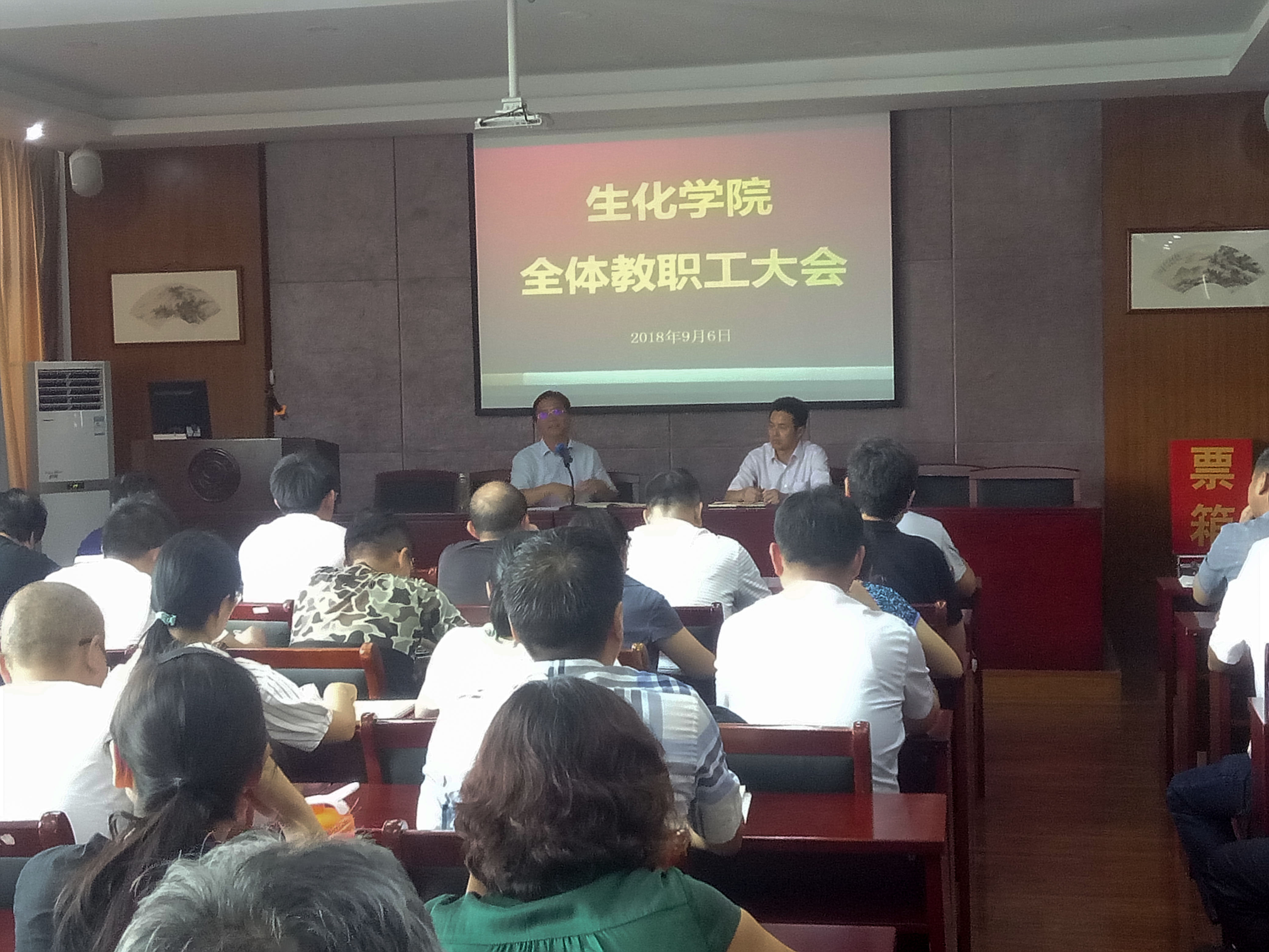 9月6日,新学期报到第一天,举行生化学院全体教工大会,学院党委书记毛建卫老师传送龚书记在校干部暑期读书会上讲话精神,并分析当前省内同类学院发展概况,阐述生化学院内涵发展基本思路。6位系部主任阐述了暑期工作和学科专业发展分析,院长王永江总结了三个多月来工作并布置开学工作。