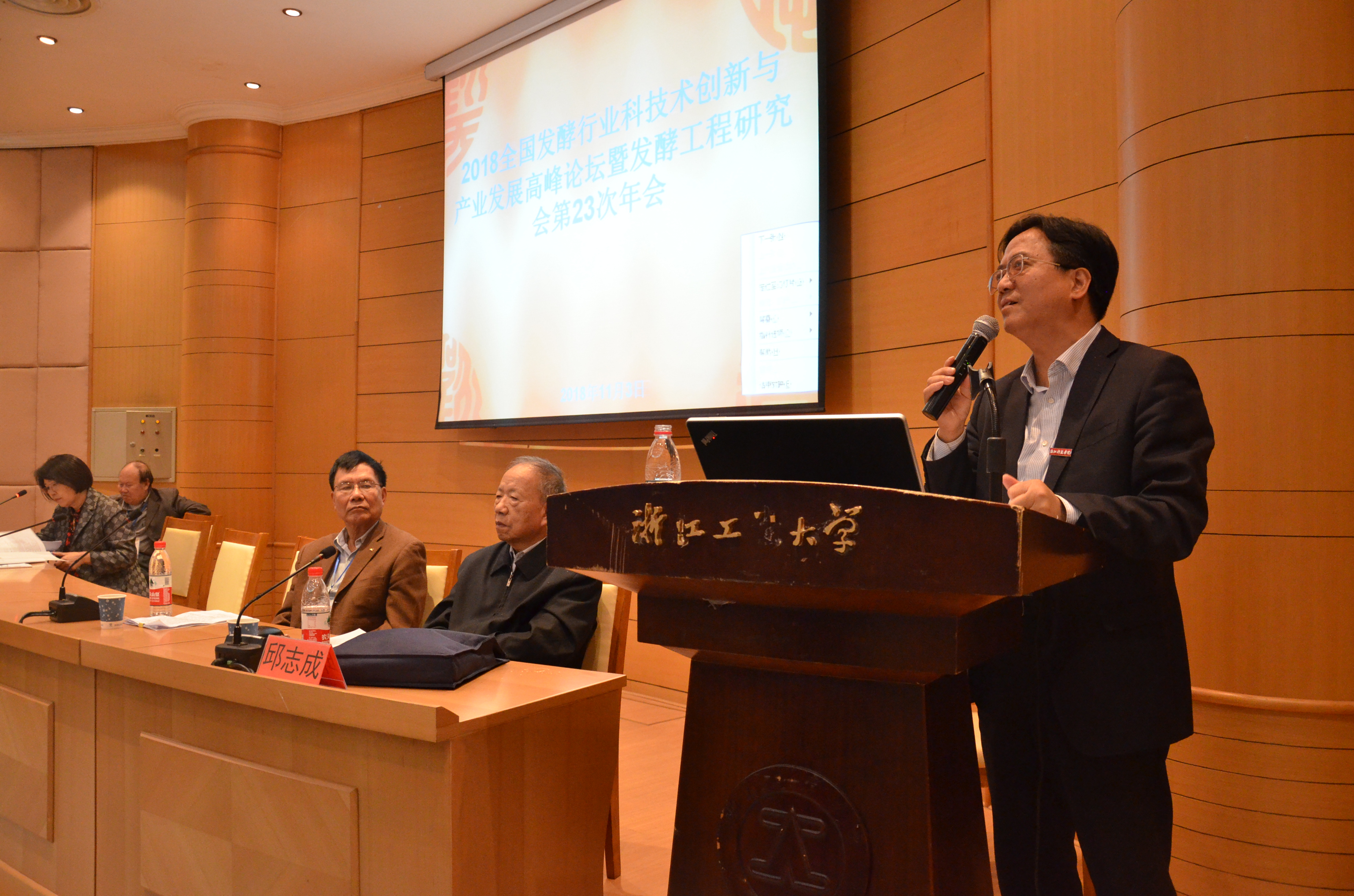 11月1日-3日,中国食品工业协会发酵工程研究会、浙工大、浙科院主办的"2018全国发酵行业高峰论坛暨发酵工程研究会第23次年会"在杭州举办。浙江工业大学生物工程学院院长、中国工程院院士郑裕国教授出席论坛并作讲话,我校党委委员、中国食品工业协会发酵工程研究会副会长毛建卫教授作题为“中国食品工业与生物发酵制造”首场主题报告,并主持了第一天上午论坛。