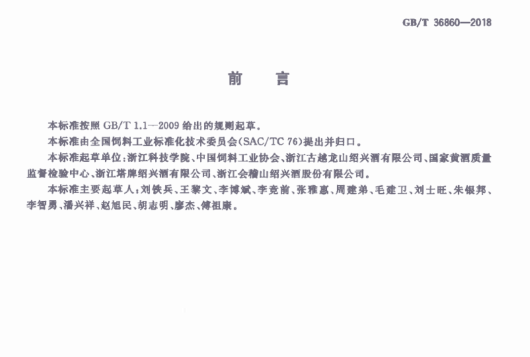该国家标准自2014年底经中国国家标准化管理委员会立项以来,由中国饲料工业协会、国家黄酒质量监督检验中心、浙江古越龙山绍兴酒有限公司、浙江塔牌绍兴酒有限公司、会稽山绍兴酒股份有限公司等单位及领导和技术人员的共同努力和国家饲料及标准相关的专家指导帮助,由国家市场监督管理总局、中国国家标准化管理委员会正式批准发布(GB/T36860-2018)。