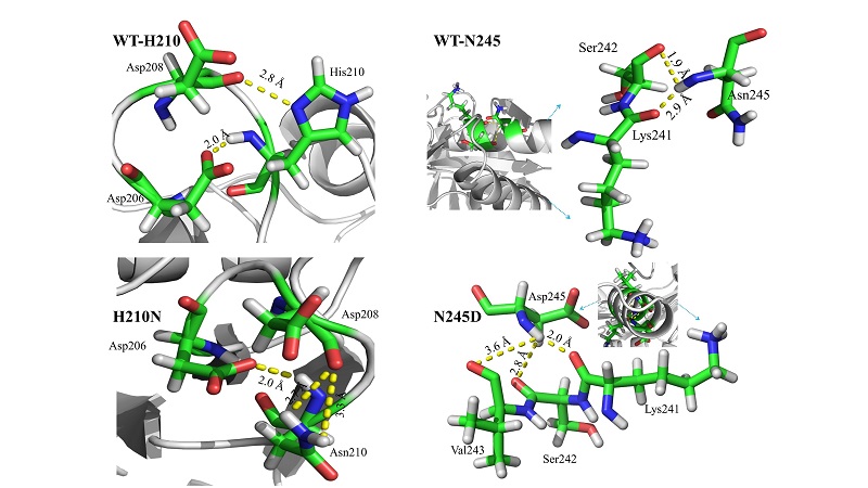 黄俊教授前期与美国明尼苏达大学Kazlauskas教授课题组合作研发了一种序列一致性突变的生物信息学在线工具(Huang J,et al, Biochemistry, 2015; Jones BJ, Lim HY, Huang J,Kazlauskas RJ,Biochemistry, 2017),通过该工具预测了与转氨酶稳定性相关的氨基酸突变位点(I77, Q97, H210, N245, G292, I295),通过基因定点突变、酶学性质测定以及分子动力学模拟,筛选的双突变体H210N/I77L在40 ℃的半衰期(t1/2)是野生酶的6.1倍,半失活温度(T50)比野生型提高6.6 ℃。然后将该方法获得的突变体H210N/I77L与引入二硫键(Huang* et al. Biotechnology and Applied Biochemistry, 2018)、B-factor结合去折叠自由能(Huang et al., Biochemical and Biophysical Research Communications, 2017)等方法结合进行组合突变,筛选到的突变体H210N/I77L/M150C-M280C半衰期(t1/2)是野生酶的16.6倍,T50比野生型提高11.8℃。