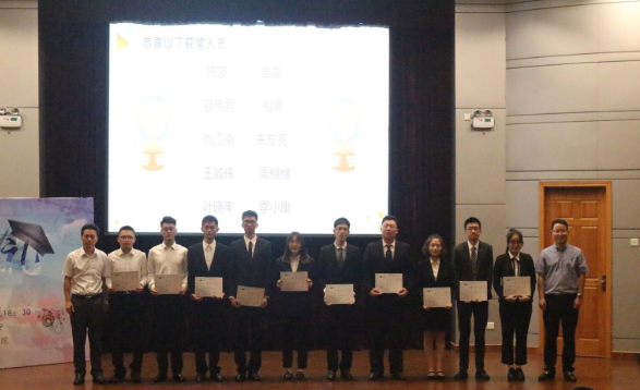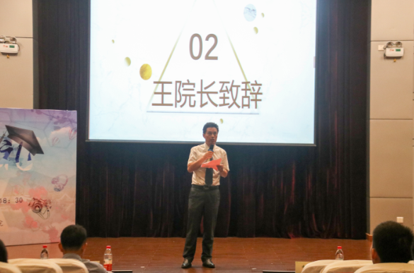 院长王永江代表学院为2019届毕业生送上最诚挚的期盼和祝福。院党委副书记程海丰,副院长黄俊、吴元峰、刘赫扬,化工系主任成忠,生工系主任沙如意,食品系主任袁秋萍,制药系主任叶春林等教师为省级、校级优秀毕业生颁奖。