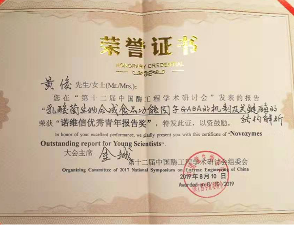 我院黄俊教授做了题为“乳酸菌生物合成食品功能因子GABA的机制及关键酶的结构解析”的分会场报告,并获得诺维信青年优秀论文奖。获此奖项的还有马富强(中国科学院苏州生物医学工程技术研究所)、周俊(南京大学)、张大伟(中国科学院天津工业生物技术研究所)、曹君(南京林业大学)、李辰(吉林大学)。(省2011协同创新中心 姚刚)