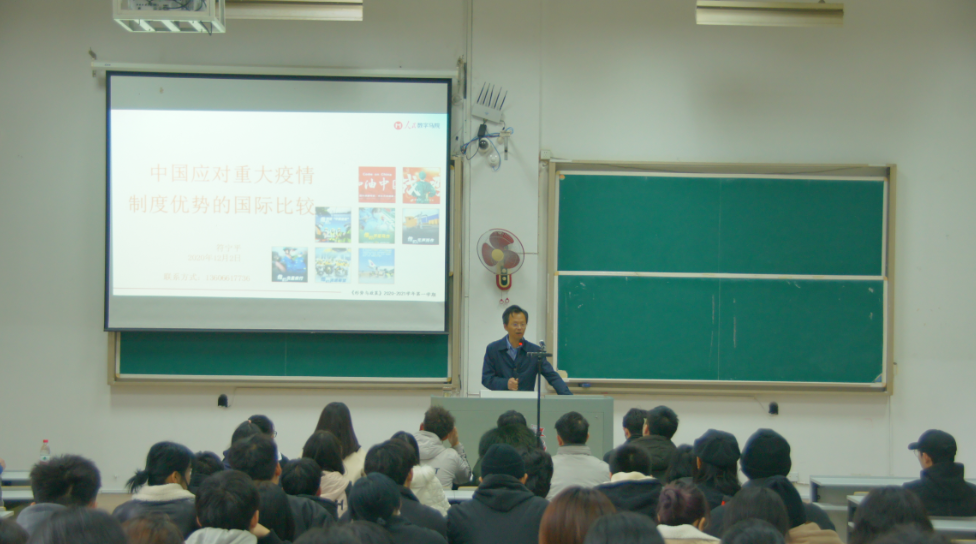 12月2日,符宁平在A3-121为学院112名学生讲授了《中国应对重大疫情制度优势的国际比较》形势与政策课,围绕“集中力量办大事是中国制度优越性的集中体现”“党的集中统一领导是中国政治制度的最大优势”“中国特色基本经济制度是我国战胜疫情的坚实基础”“应对公共危机责任机制是战胜疫情的有力支撑”四个方面,全面系统阐释了在面对这场前所未知、突如其来、来势汹汹的疫情天灾时,中国果断打响疫情防控阻击战的制度优势。(新闻办 范玉凤 学工办 范俊强 牛讯文化传媒中心)