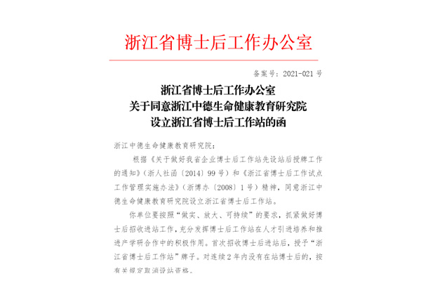 近日,浙江中德生命健康教育研究院获得省博士后工作办公室批准,成功设立我校首个博士后工作站。