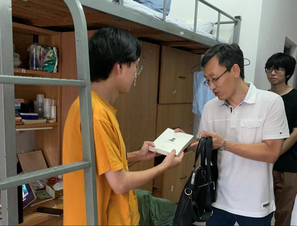9月13日,生化学院院长黄俊和党委书记路胜利分别率领新生班主任、辅导员、助班等一同走访新生宿舍。走访期间,院长和书记分别对研究生和化专新生以往的成绩表示了肯定,并寄予殷切希望,祝愿每位新生都能在今后的学习生活中积极奋进,得偿所愿。黄俊院长向同学们分发了校徽,并提醒大家快速调整好状态,掌握好研究生学习生活的节奏,找到适合自己的课题和研究方向。路书记在了解到化专新生中有来自新疆的学生时,特意为其准备了一本书籍《罪与罚》,希望学生能够学习书中主人公在苦难生活中的精神,自身也能做到积极向上。