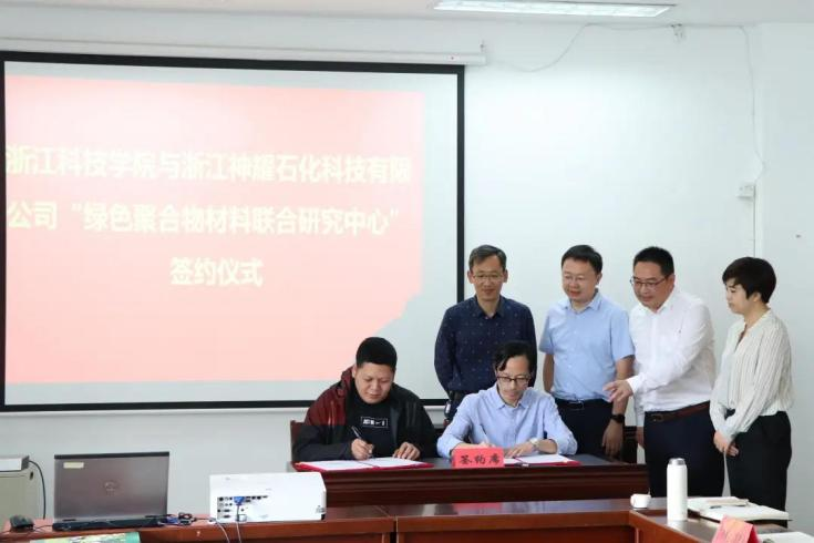 会议上,生化学院党委与中共建德市科学技术局机关支部委员会签订了党建联盟协议,学院与浙江神耀石化科技有限公司共建“绿色聚合物材料联合研究中心”正式签约。