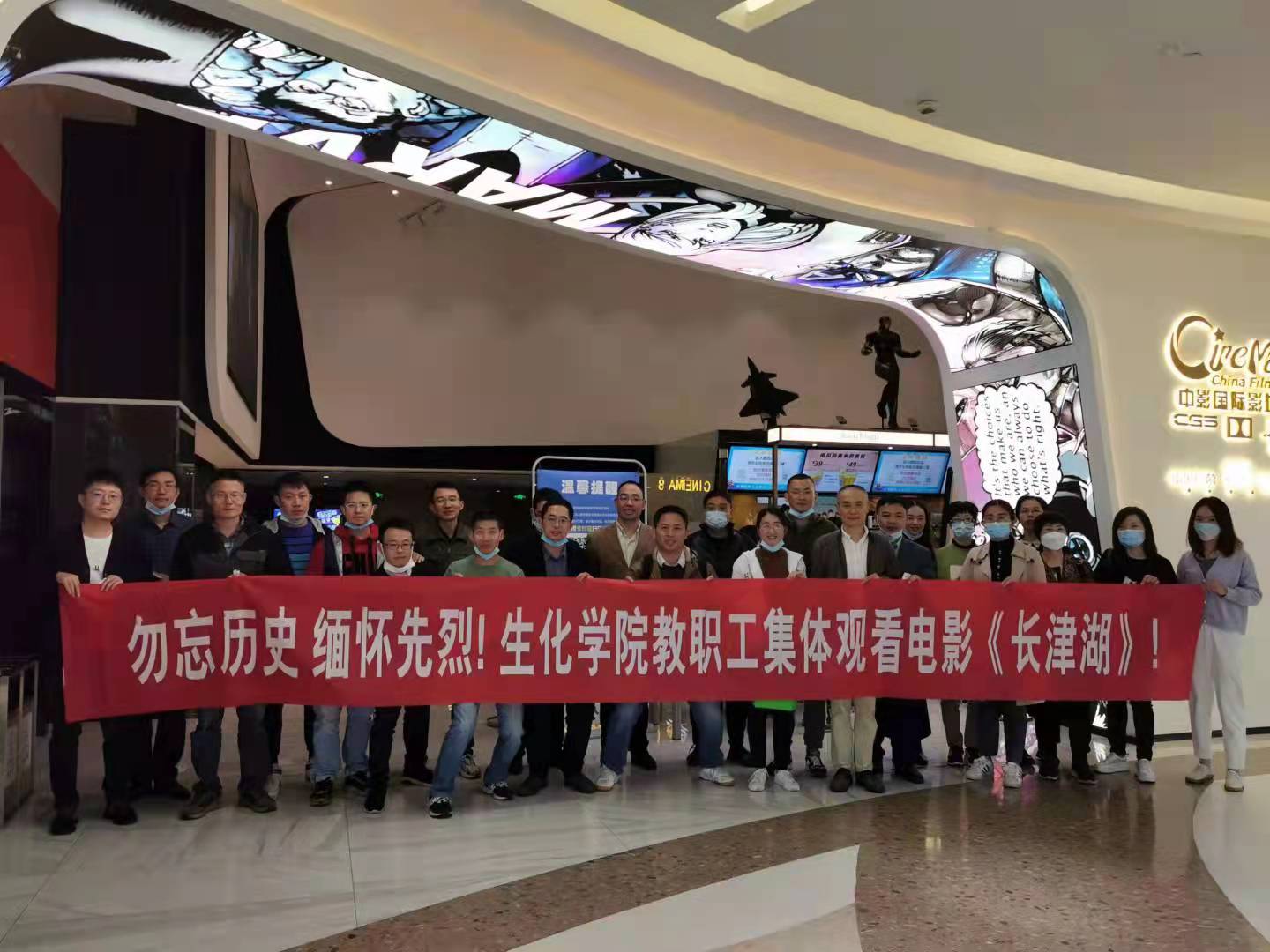为进一步弘扬爱国主义精神,激发教职工的爱国热情,深入推进党史学习教育走实走深,10月22日生化学院组织教职工集体观看了抗美援朝题材电影《长津湖》,传承红色基因,汲取奋进之志。