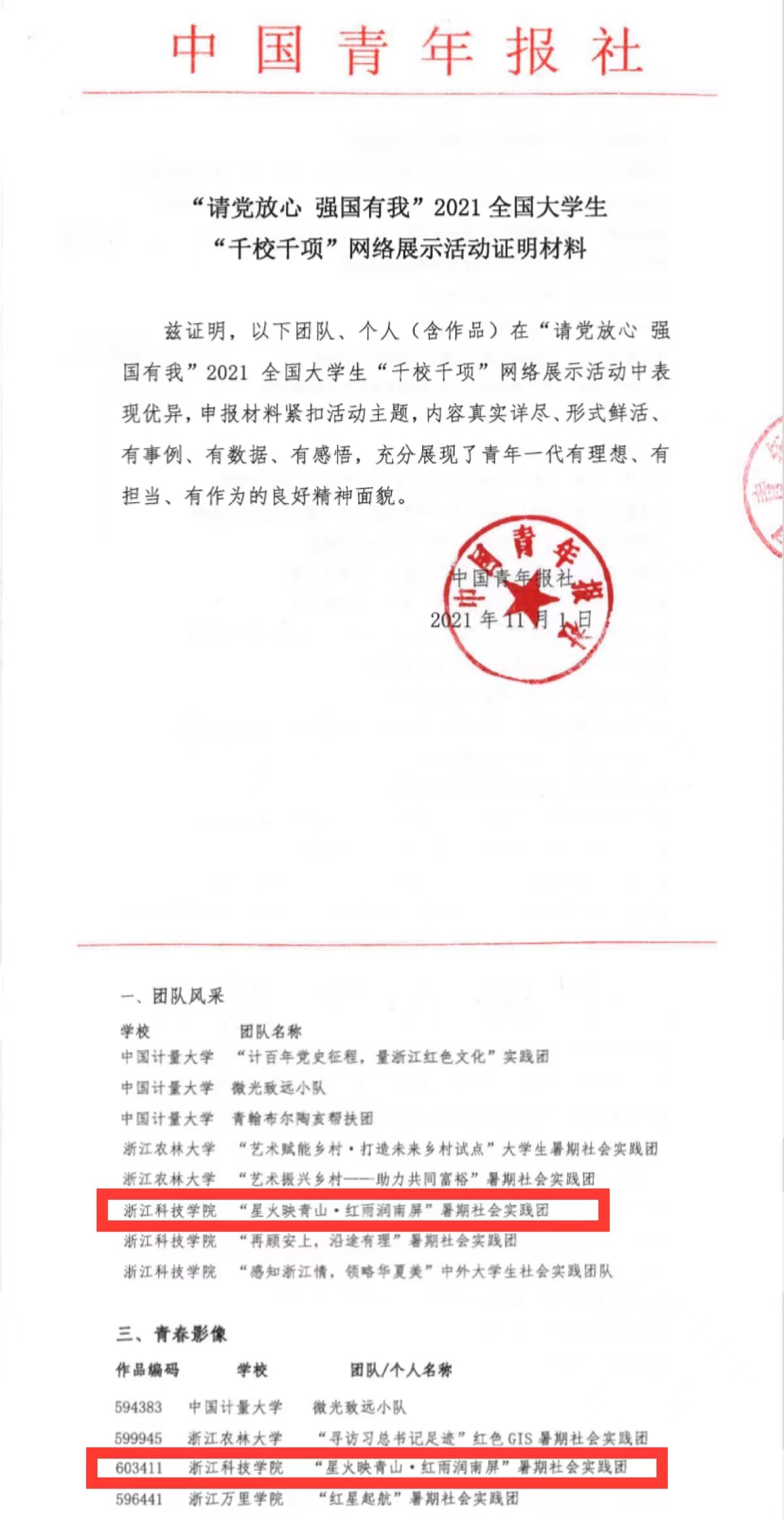 近日,以“请党放心 强国有我”为主题的2021全国大学生“千校千项”网络展示活动评选结果公布。我院“星火映青山·红雨润南屏”暑期社会实践团(南屏团队)脱颖而出,获得“团队风采”和“青春影像”荣誉称号,为学校唯一一支获得两份荣誉的队伍。