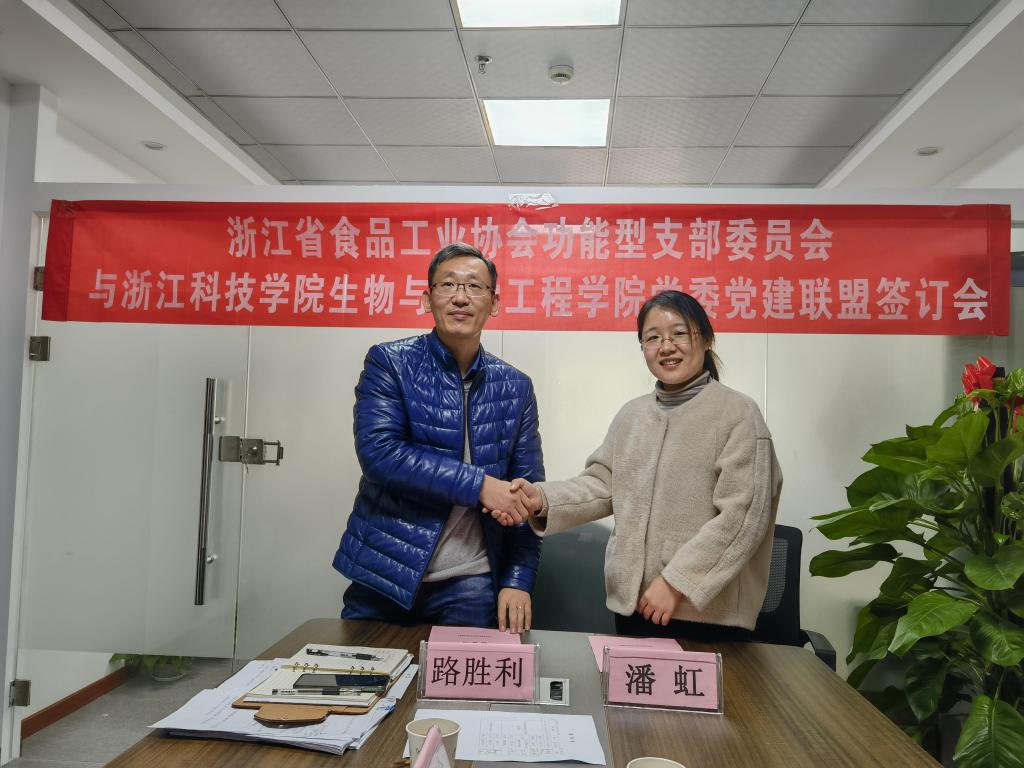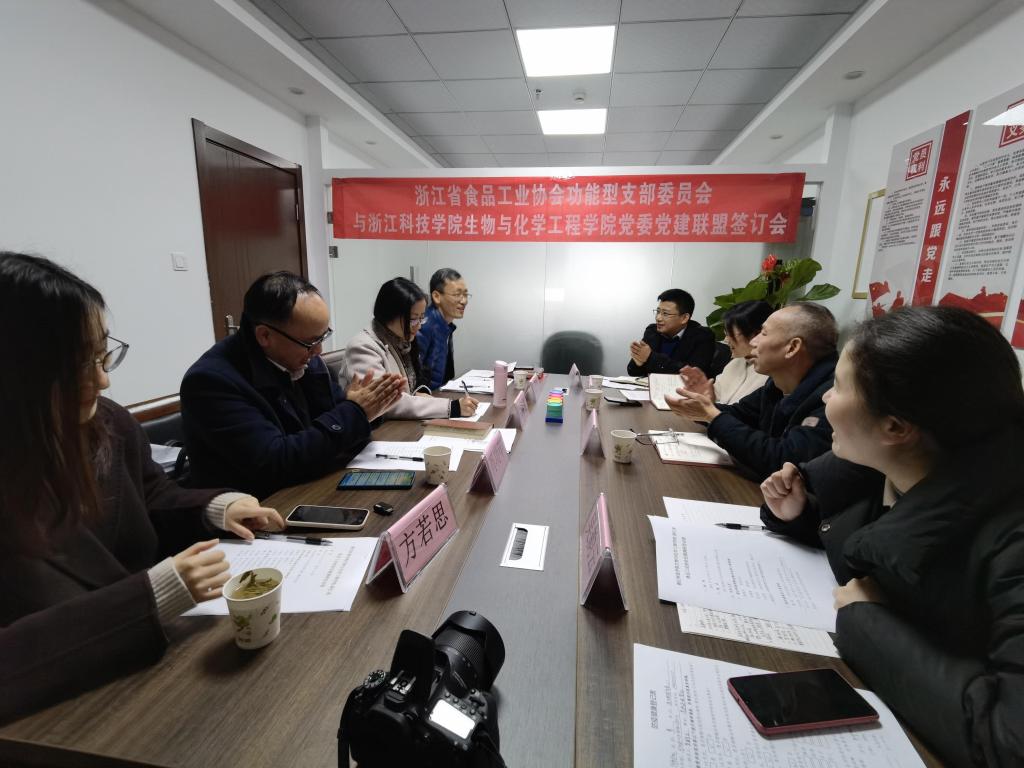 浙江省食品工业协会秘书长潘虹、副秘书长孙文彦、浙江省经信厅中小企业局办公室副主任苏保涛等予以热情接待。潘秘书长详细介绍了浙江省食品工业协会的历史和基本情况,尤其介绍了与生化学院长期建立的良好合作关系。路胜利书记介绍了学院党建工作情况,表示双方共建党建联盟,将围绕党建和产学研合作的实际需求,切实发挥党建引领作用,双方签订了“中共浙江科技学院生化学院党委-中共浙江省食品工业协会功能型支部委员会‘党建联盟’共建协议”,将在党课互授、支部互联、人员互访等方面开展结对联建工作。