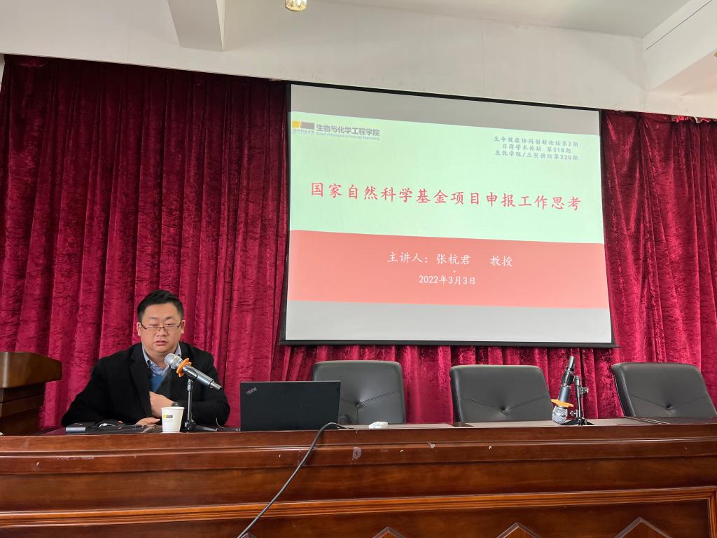 3月3日上午,学院召开生命健康协同创新论坛第2期(生化学院/三实讲坛第328期,习得学术论坛第318期)学术讲座,邀请了杭州师范大学科研处处长张杭君教授作了题为“国家自然科学基金项目申报工作思考”的主题报告。