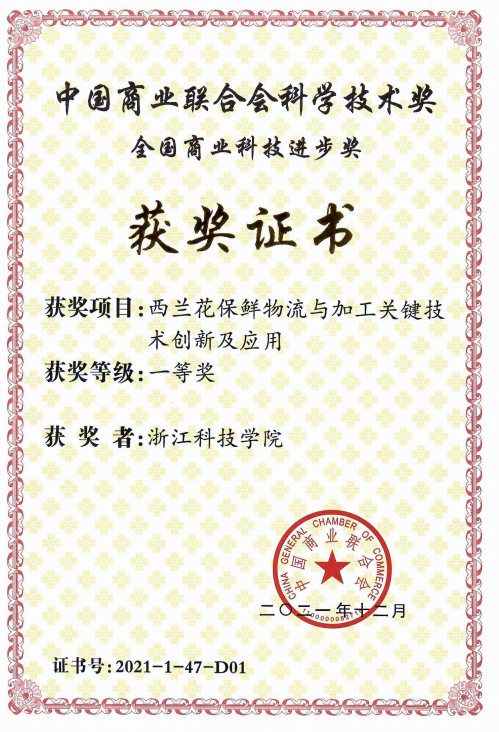 该成果由浙江科技学院、浙江大学、国家农产品保鲜工程技术研究中心(天津)、杭州市农业科学研究院、浙江葵瑞农业开发有限公司、江苏兴野食品有限公司等联合完成,针对西兰花精准保鲜技术和物流装备落后,采后损失严重;以初级产品为主,加工占比低,产品单一等问题,实现了对西兰花等特色果蔬品质维持关键靶标蛋白的级联耦合调控,突破了困扰西兰花等特色果蔬物流保鲜行业发展的技术瓶颈;开发了西兰花活性物高效精深加工工艺,在西兰花绿色增值加工技术体系开发方面取得了系列科技创新成果,并规模化推广应用,取得了良好的经济效益和社会效益。