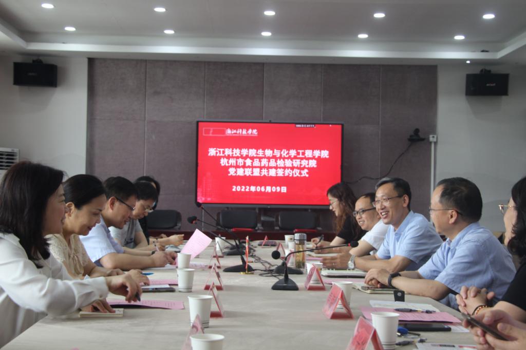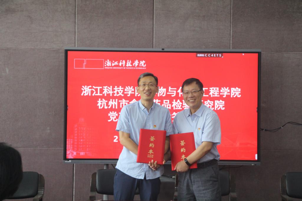 会上,双方签订了“中共浙江科技学院生化学院委员会-中共杭州市食品药品检验研究院委员会‘党建联盟’共建协议”, 根据协议,双方将围绕党建和产学研合作实际需求,切实发挥党建引领作用,在理论联学、党务联动、科研联攻、活动联办、品牌联创等方面开展结对联建工作。