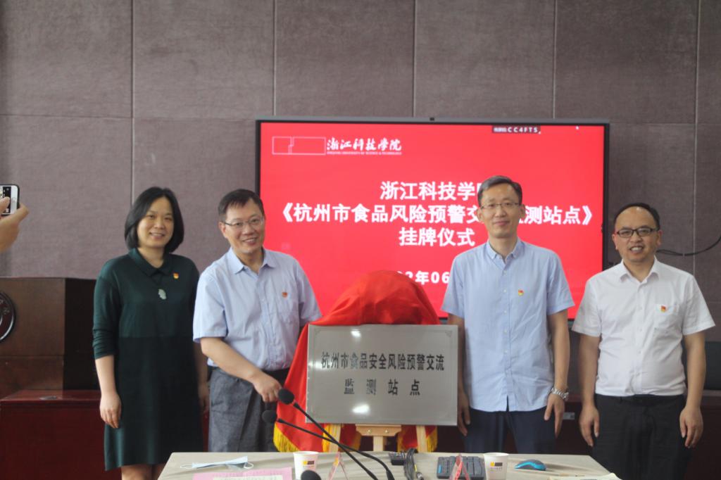 随后,杭州市食药院倪伟红主任介绍了杭州市食品风险预警交流监测站点基本情况,并进行浙江科技学院“杭州市食品风险预警交流监测站点”的挂牌仪式。