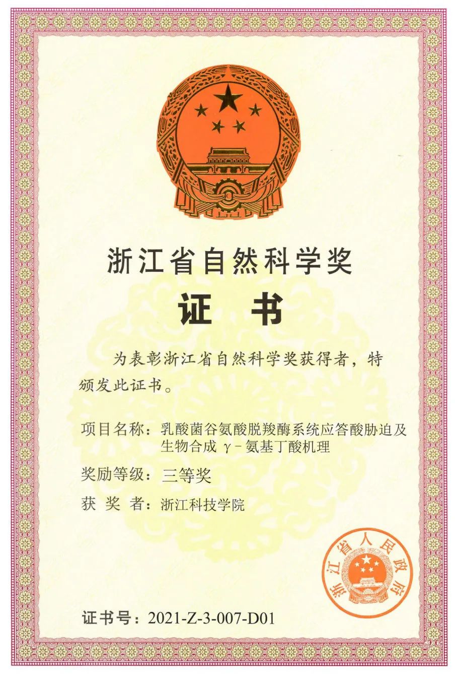 7月11日,浙江省科技创新大会在省人民大会堂举行。浙江省委书记袁家军,省委副书记、省长王浩等领导出席会议。校长陈建孟应邀参加会议。我黄俊教授主持、吕常江老师参与完成的“乳酸菌谷氨酸脱羧酶系统应答酸胁迫及生物合成γ-氨基丁酸机理”成果获浙江省自然科学奖三等奖。