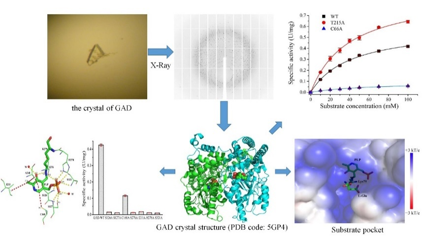 该成果针对乳酸菌生物合成新资源食品γ-氨基丁酸(GABA)的唯一关键限速酶—谷氨酸脱羧酶(GAD)开展了系统性研究,筛选到具有自主知识产权的高产γ-氨基丁酸(GABA)乳酸菌Lactobacillus brevis CGMCC 1306,鉴别并阐明了该菌株染色体上谷氨酸脱羧酶(GAD)操纵子结构及各功能元件的转录表达调控机制,解析了L. brevis GAD的晶体结构并从分子水平揭示了GAD的催化机制,提出并验证了pH调控GAD催化活性的机理假说,发展了GAD的酶分子改造手段,创新性地采用人工神经网络与粒子群进化算法相结合的过程优化方法,以及细胞固定化发酵、弱化内源F0F1-ATPase、耦合乳酸发酵等手段,对乳酸菌催化合成GABA的过程进行了强化,为利用蛋白质工程和代谢工程等手段实现了GABA高产工程菌株的构建、GABA的高效合成提供了重要的理论指导和技术支撑。