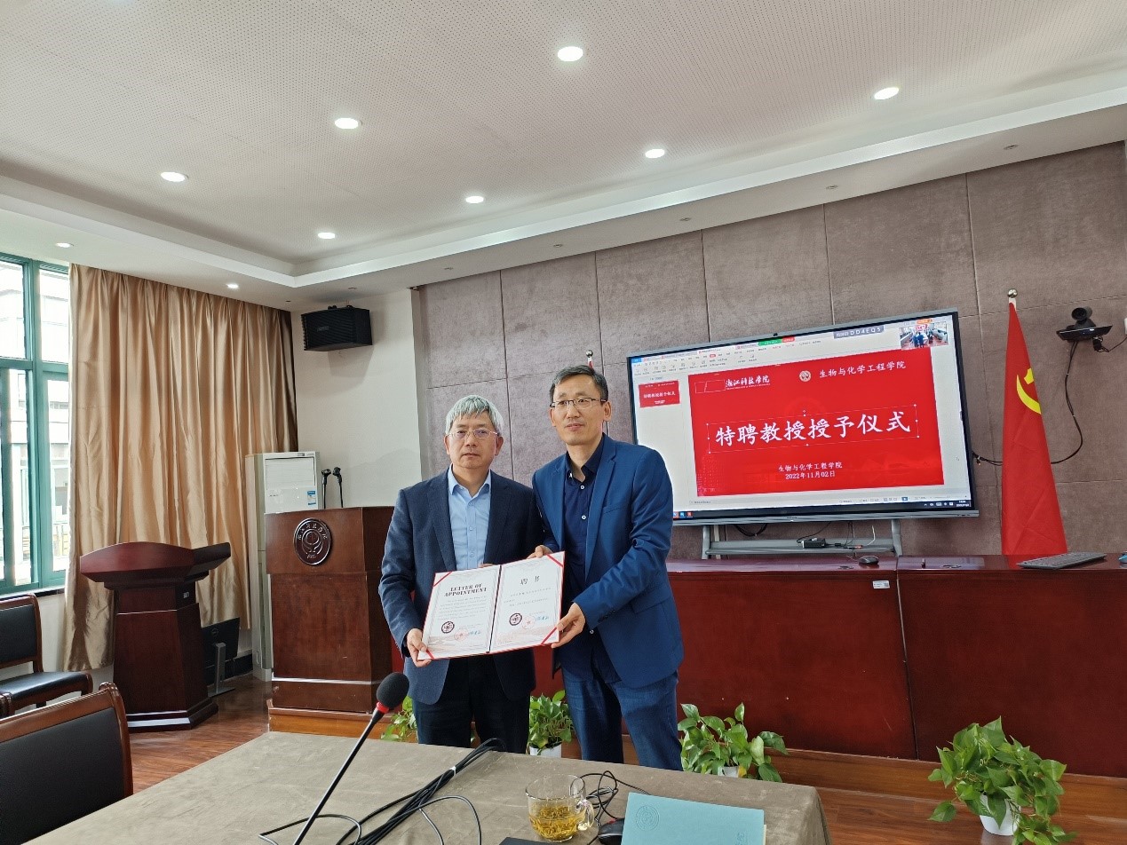 报告会开始前,路胜利为王旭教授颁发浙江科技学院“特聘教授”证书。