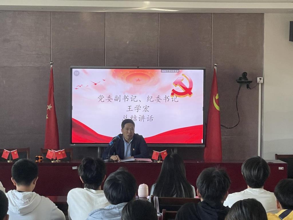 最后,学院党委副书记、纪委书记王学宏从五个方面进行了总结。他首先阐述了学风的内涵及学风建设的重要意义,指出学风是学校办学思想、育人质量和管理水平的重要标志,也是学生思想品质、学习态度和综合素质的重要体现,优良学风是激励学生奋发向上、努力成才的无形的精神力量。接着分析了学院学风现状和存在的一些问题,强调学院非常重视学风建设,注重学生培养,始终将学风建设作为学院发展的重要一环,近年来也取得了很多扎实的成效。号召学生党员在学风建设中:要有发展意识,从自身出发,勤于学习,不断提升综合素质;要有党员意识,守牢初心、勇担使命、勤于服务、甘于奉献;要有团队精神,在榜样寝室、特优学风班、“学风领航团”创建中发挥积极作用。最后希望大家都能有朝气、锐气和志气,做一个有梦想有追求的“三实”学子。