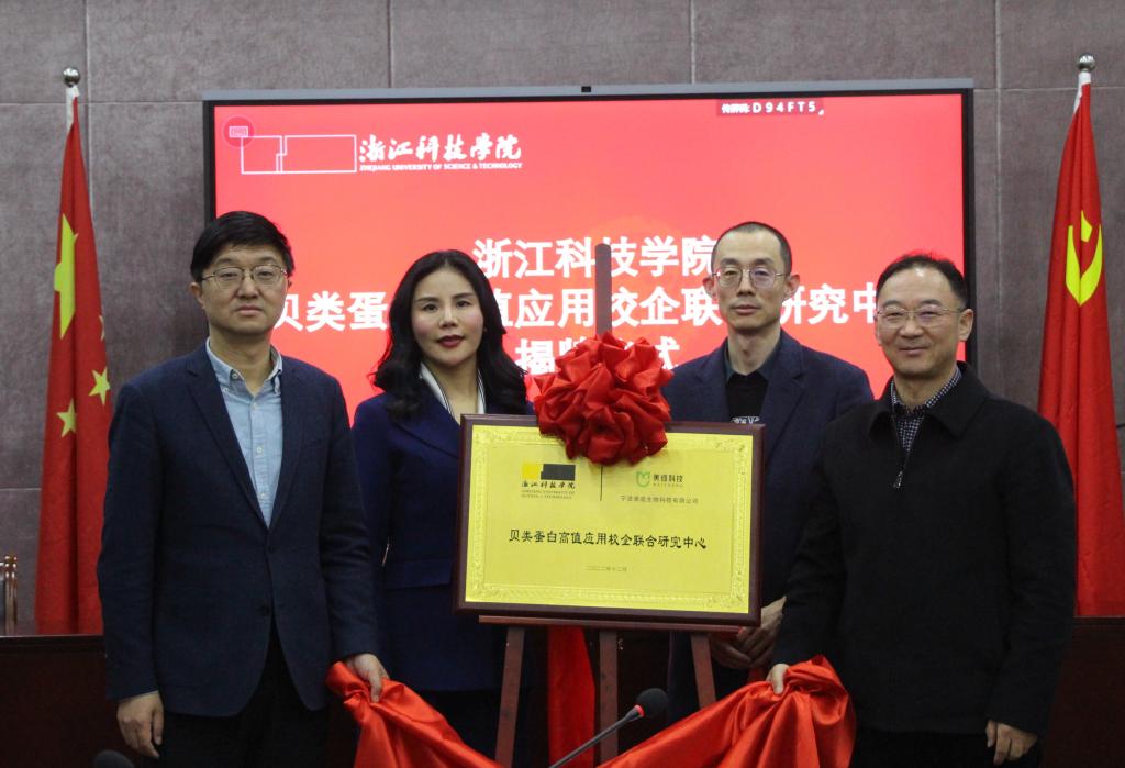 校党委副书记冯军与顾世东副局长等为“贝类蛋白高值应用校企联合研究中心”揭牌。
