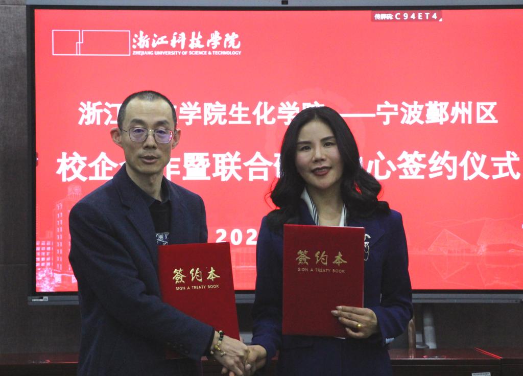 冯军对鄞州科技局及美成生物科技公司相关领导的到来表示热烈欢迎。他指出,前期我校已与鄞州区有了良好的合作基础,希望以此次联合研究中心签约为契机,继续加强校地合作,通过科研合作、人才培育及教育实践等更好服务地方产业行业发展,为浙江省“两个先行”贡献一份浙科力量。