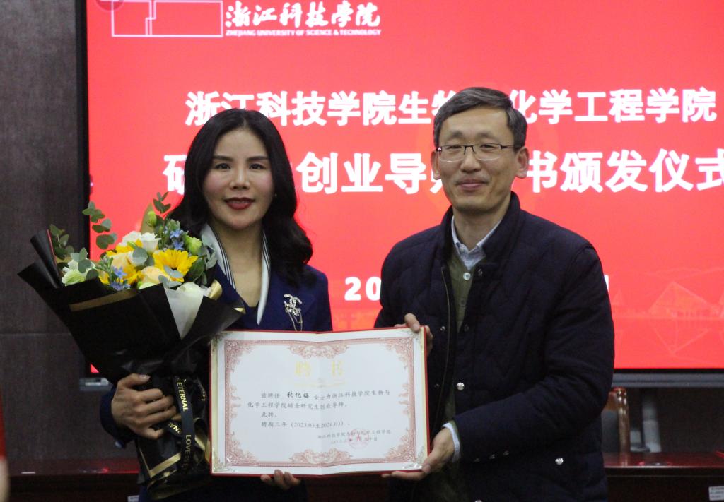 院党委书记路胜利为美成生物科技有限公司董事长张化梅、总经理陈道定颁发了研究生创业导师聘书。