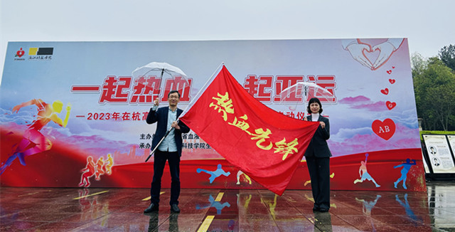 浙江省血液中心潘凌凌副主任为浙江科技学院授“热血先锋”旗帜。潘凌凌副主任表示,今年是意义非凡的一年,第19届亚运会将于9月23日在杭州拉开序幕。作为大型国际性赛会,杭州也将迎来大批各国的运动员、官员、记者和游客,血液保障是确保杭州亚运会顺利举行非常重要的一环。她呼吁各高校积极开展献血活动,共同用爱心和热血迎接亚运盛会的到来,为保障血液安全筑起坚实的后盾。浙江省血液中心也将一如既往地支持和配合学校开展多种形式的无偿献血活动及宣传教育等工作,并不断提升服务质量,共同为亚运会保驾护航。