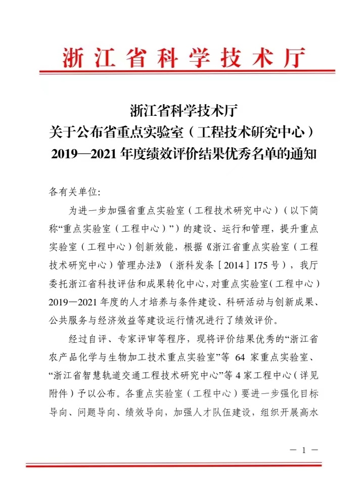 近日,浙江省科学技术厅公布省重点实验室(工程技术研究中心)2019-2021年度绩效评价结果。经过自评、专家评审等程序,生化学院“浙江省农产品化学与生物加工技术重点实验室”绩效评价结果优秀。