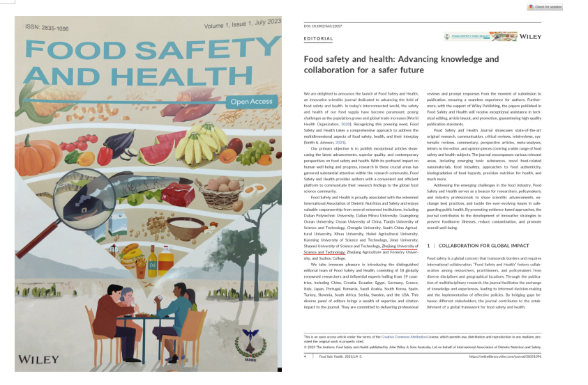 近日,由我校和大连工业大学等12个单位共同创办,Wiley出版集团出版的新晋食品英文期刊Food Safety and Health(FSH)第1期正式上线。本期包含2篇社评、4篇综述型文章、2篇研究型文章和4篇评注型文章,全部论文均为开放获取。