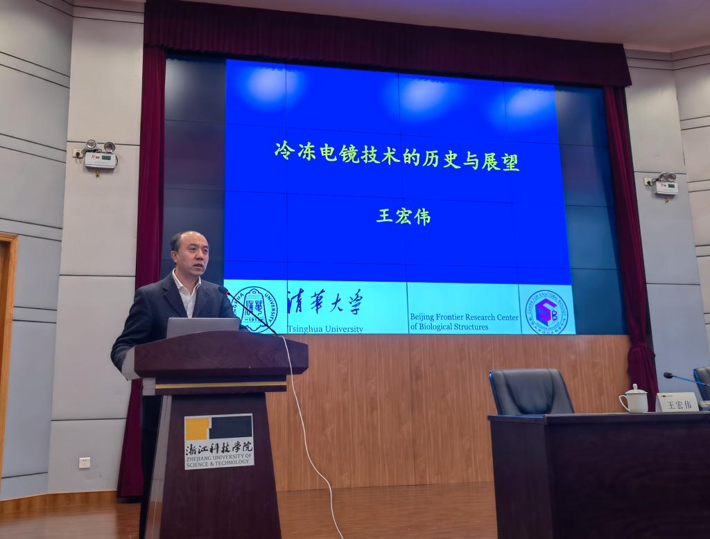 11月26日上午,清华大学副校长、著名结构生物学家王宏伟教授应我校之邀,在小和山校区图书馆西报告厅作了题为“冷冻电镜的历史与展望”的专题报告。学校副校长李其朋教授、浙江工业大学制药学院院长王亚军教授、浙江农林大学研究生院副院长杨胜祥教授、williamhill中国院长黄俊教授及生化学院师生200余人聆听了报告。报告会由李其朋主持,此次报告为生化学院“三实讲坛”第341期。
